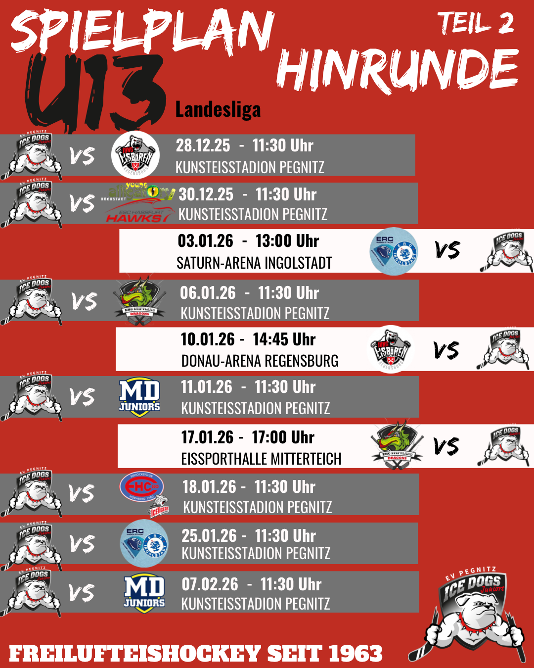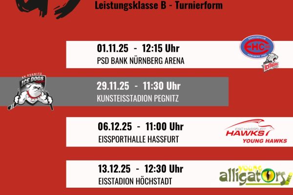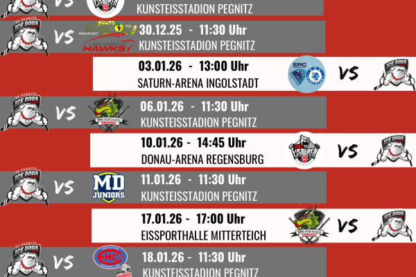 Hier findet ihr alle aktuellen Spieltermine unserer ICE DOGS JUNIORS auf einen Blick. Ob Heimspiel oder Auswärtsbegegnung – bleibt immer auf dem Laufenden und unterstützt unser Team lautstark vor Ort!